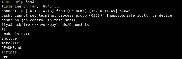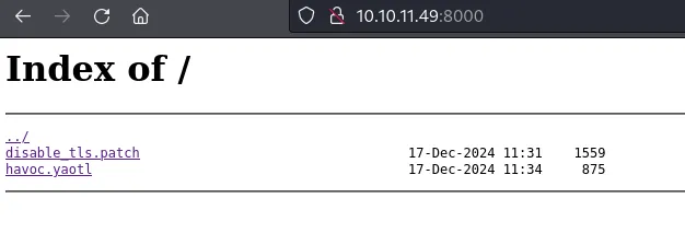 Starting Nmap 7.94SVN ( https://nmap.org ) at 2025-01-21 04:32 ESTNmap scan report for 10.10.11.49Host is up (0.084s latency).Not shown: 997 closed tcp ports (conn-refused)PORT STATE SERVICE VERSION22/tcp open ssh OpenSSH 9.2p1 Debian 2+deb12u4 (protocol 2.0)| ssh-hostkey:| 256 7d:6b:ba:b6:25:48:77:ac:3a:a2:ef:ae:f5:1d:98:c4 (ECDSA)|_ 256 be:f3:27:9e:c6:d6:29:27:7b:98:18:91:4e:97:25:99 (ED25519)443/tcp open ssl/http nginx 1.22.1| tls-alpn:| http/1.1| http/1.0|_ http/0.9|_http-title: 404 Not Found|_http-server-header: nginx/1.22.1|_ssl-date: TLS randomness does not represent time| ssl-cert: Subject: commonName=127.0.0.1/organizationName=LLC/stateOrProvinceName=/countryName=US| Subject Alternative Name: IP Address:127.0.0.1| Not valid before: 2024-04-11T07:55:12|_Not valid after: 2027-04-11T07:55:128000/tcp open http nginx 1.22.1|_http-open-proxy: Proxy might be redirecting requests| http-ls: Volume /| SIZE TIME FILENAME| 1559 17-Dec-2024 11:31 disable_tls.patch| 875 17-Dec-2024 11:34 havoc.yaotl|_|_http-title: Index of /|_http-server-header: nginx/1.22.1Service Info: OS: Linux; CPE: cpe:/o:linux:linux_kernelPort 8000