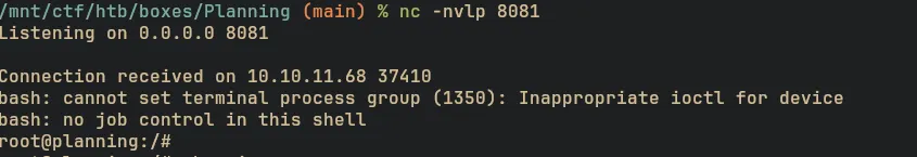 netstat -tulnpActive Internet connections (only servers)Proto Recv-Q Send-Q Local Address Foreign Address State PID/Program nametcp 0 0 127.0.0.1:33060 0.0.0.0:* LISTEN -tcp 0 0 127.0.0.1:3306 0.0.0.0:* LISTEN -tcp 0 0 127.0.0.54:53 0.0.0.0:* LISTEN -tcp 0 0 127.0.0.1:8000 0.0.0.0:* LISTEN -tcp 0 0 127.0.0.1:3000 0.0.0.0:* LISTEN -tcp 0 0 0.0.0.0:80 0.0.0.0:* LISTEN -tcp 0 0 127.0.0.1:42607 0.0.0.0:* LISTEN -tcp 0 0 127.0.0.53:53 0.0.0.0:* LISTEN -tcp6 0 0 :::22 :::* LISTEN -udp 0 0 127.0.0.54:53 0.0.0.0:* -udp 0 0 127.0.0.53:53 0.0.0.0:* -enzo@planning:/opt/crontabs$ cat crontab.db{"name":"Grafana backup","command":"/usr/bin/docker save root_grafana -o /var/backups/grafana.tar && /usr/bin/gzip /var/backups/grafana.tar && zip -P P4ssw0rdS0pRi0T3c /var/backups/grafana.tar.gz.zip /var/backups/grafana.tar.gz && rm /var/backups/grafana.tar.gz","schedule":"@daily","stopped":false,"timestamp":"Fri Feb 28 2025 20:36:23 GMT+0000 (Coordinated Universal Time)","logging":"false","mailing":{},"created":1740774983276,"saved":false,"_id":"GTI22PpoJNtRKg0W"}{"name":"Cleanup","command":"/root/scripts/cleanup.sh","schedule":"* * * * *","stopped":false,"timestamp":"Sat Mar 01 2025 17:15:09 GMT+0000 (Coordinated Universal Time)","logging":"false","mailing":{},"created":1740849309992,"saved":false,"_id":"gNIRXh1WIc9K7BYX"}Port Forward 8000