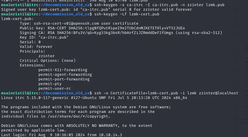 ssh -o CertificateFile=lzmk-cert.pub -i lzmk zzinter@localhost